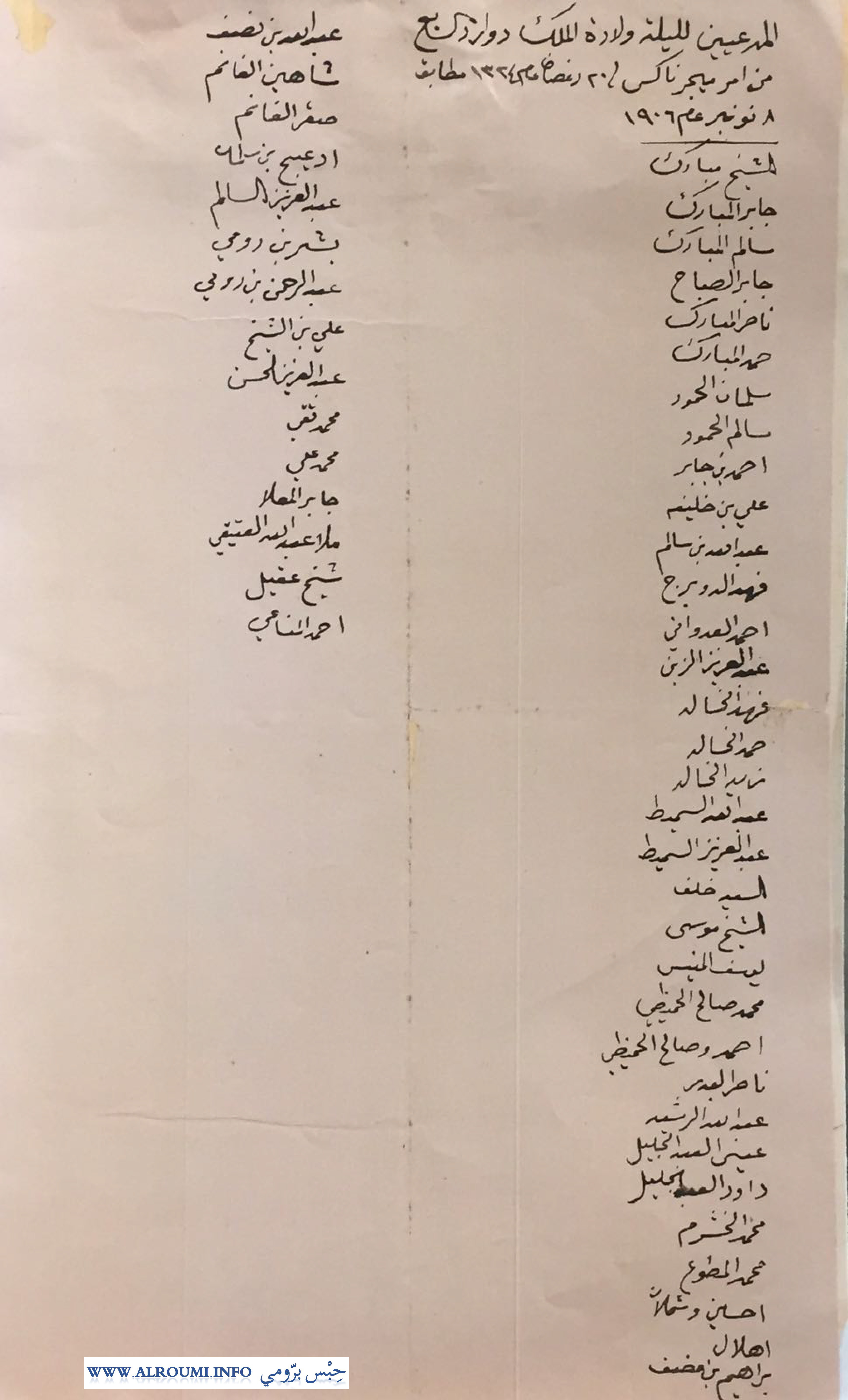 وثيقة نادرة بخط عبدالله عبدالإله القناعي.. والذي حصل على لقب خان بهادر ، وهو كاتب المعتمد البريطاني (الوثيقة من أرشيف خان بهادر عبدالإله القناعي) وهذه الوثيقة عبارة عن دعوة بأمر أول معتمد بريطاني بالكويت وهو الكولونيل نوكس ، وتاريخها 8 نوفمبر عام 1906م ، عمرها 111 سنة وحررت في زمن حاكم الكويت السابع الشيخ مبارك الصباح ، والدعوة موجهة لبعض شيوخ ووجهاء الكويت لحضور حفل ولادة الملك إدوارد السابع. والمدعوين من الشيوخ والوجهاء لحضور الحفل في دار الاعتماد البريطاني (بيت ديكسون) وهمالشيخ مبارك الصباح ، الشيخ جابر المبارك الصباح ، الشيخ سالم المبارك الصباح ، الشيخ جابر الصباح ، الشيخ ناصر المبارك ، الشيخ حمد المبارك ، الشيخ سلمان الحمود ، الشيخ سالم الحمود ، الشيخ أحمد الجابر ، الشيخ علي الخليفة ، الشيخ عبدالله السالم ، فهد الدويرج (الدويري) ، أحمد العدواني ، عبدالعزيز الزبن ، فهد الخالد ، حمد الخالد ، زيد الخالد ، عبدالله السميط ، عبدالعزيز السميط ، السيد خلف النقيب ، الشيخ موسى العبدالرزاق ، يوسف منيس الدويري ، محمد صالح الحميظي ، أحمد وصالح الحميظي ، ناصر يوسف البدر ، عبدالله الرشيد البدر ، عيسى ابراهيم العبد الجليل ، داود سليمان العبد الجليل ، محمد الخشرم ، محمد المطوع ، حسين وشملان أبناء علي آل سيف ، هلال بن فجحان المطيري ، ابراهيم المضف ، عبدالله النصف ، شاهين الغانم ، صقر الغانم ، الشيخ دعيج بن سلمان الصباح (قائد معركة حمض) ، عبدالعزيز السالم البدر ، بشر الرومي ، عبدالرحمن الرومي ، علي بن الشيخ ، عبدالعزيز الحسن (أهل نجد) ، محمد تقي (ماتقي غالب) ، محمد علي (معرفي) ، جابر المعلا ، ملا عبدالله العتيقي ، شيخ عقيل ، أحمد المناعي